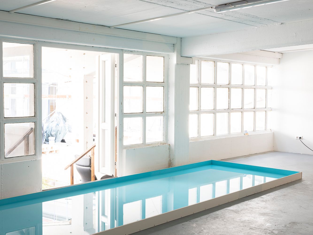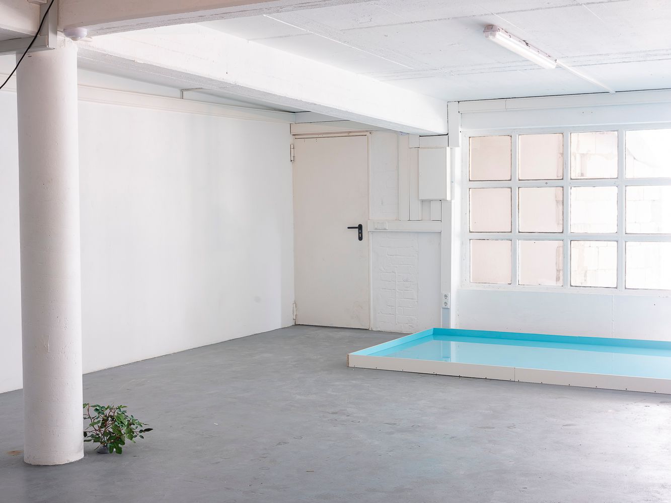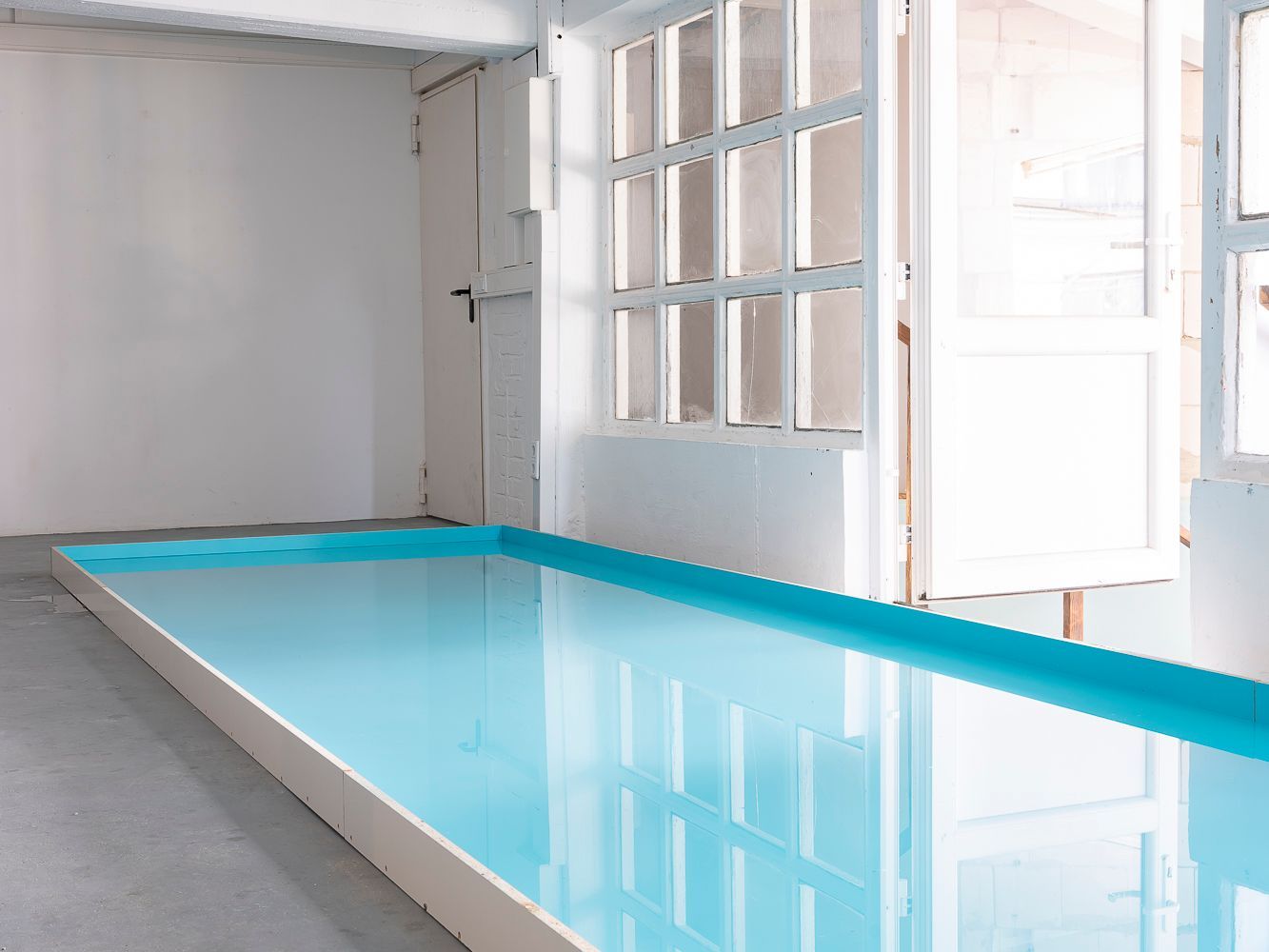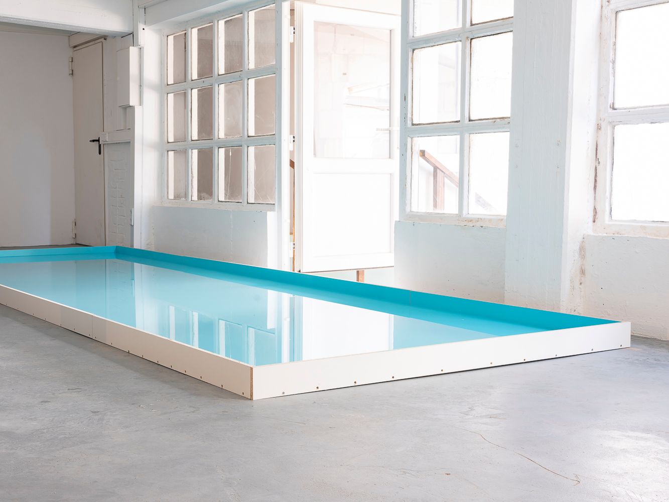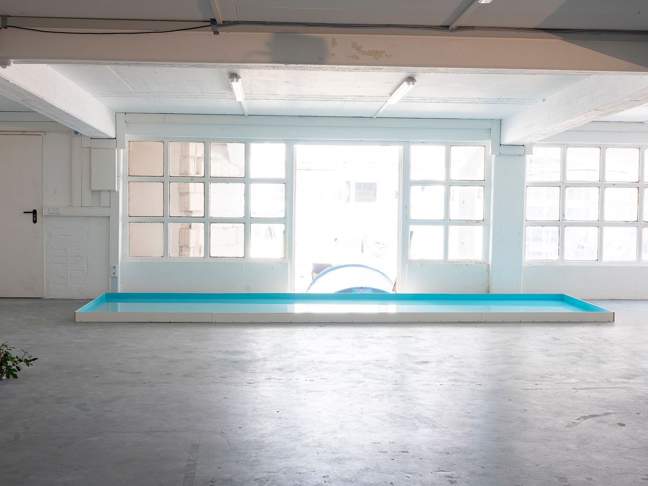 The 600cm x 170cm x 20cm high barrier is placed directly behind the entrance to the exhibition space and filled with an about 5cm deep layer of water. The long shape with the turquoise-blue color is designed in remembrance of a swimming pool, while the width of the object is just enough to be unable to jump over.