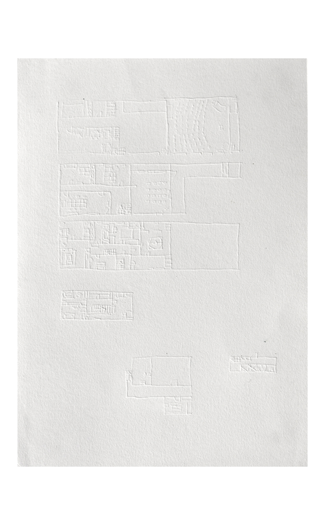 She then decided to not show the actual sketch, but the paper under it, minimizing and reducing the sketch while leaving the viewer with nothing more than the inprint of the ballpen on paper. The whole inprint can just be seen with the right angle of light and when the viewer gets very close to the paper, alluding to the loss, uncertainness and fluidity of memory.